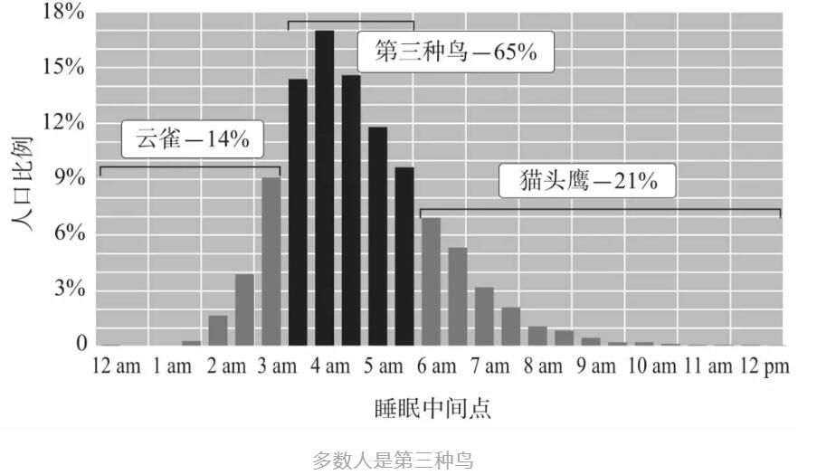 平克认为:每个人都有自己的“时间类型”(chronotype),它们大致可以分为“猫头鹰型”、“云雀型”和“第三种鸟”。
