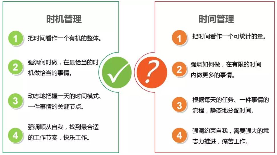 时间管理把个人所拥有的时间看作可统计的量,而时机管理把个人所拥有的时间看作一个有机整体。不同的时间,做事效果也会不同。因而时机管理就是了解时间背后的规律,有针对地行事,提升工作效率。