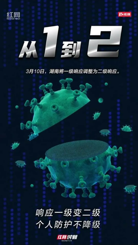 3月10日,湖南省新冠肺炎疫情防控领导小组发布重大决定:湖南省新冠肺炎疫情防控突发卫生公共事件由一级响应调整为二级响应!