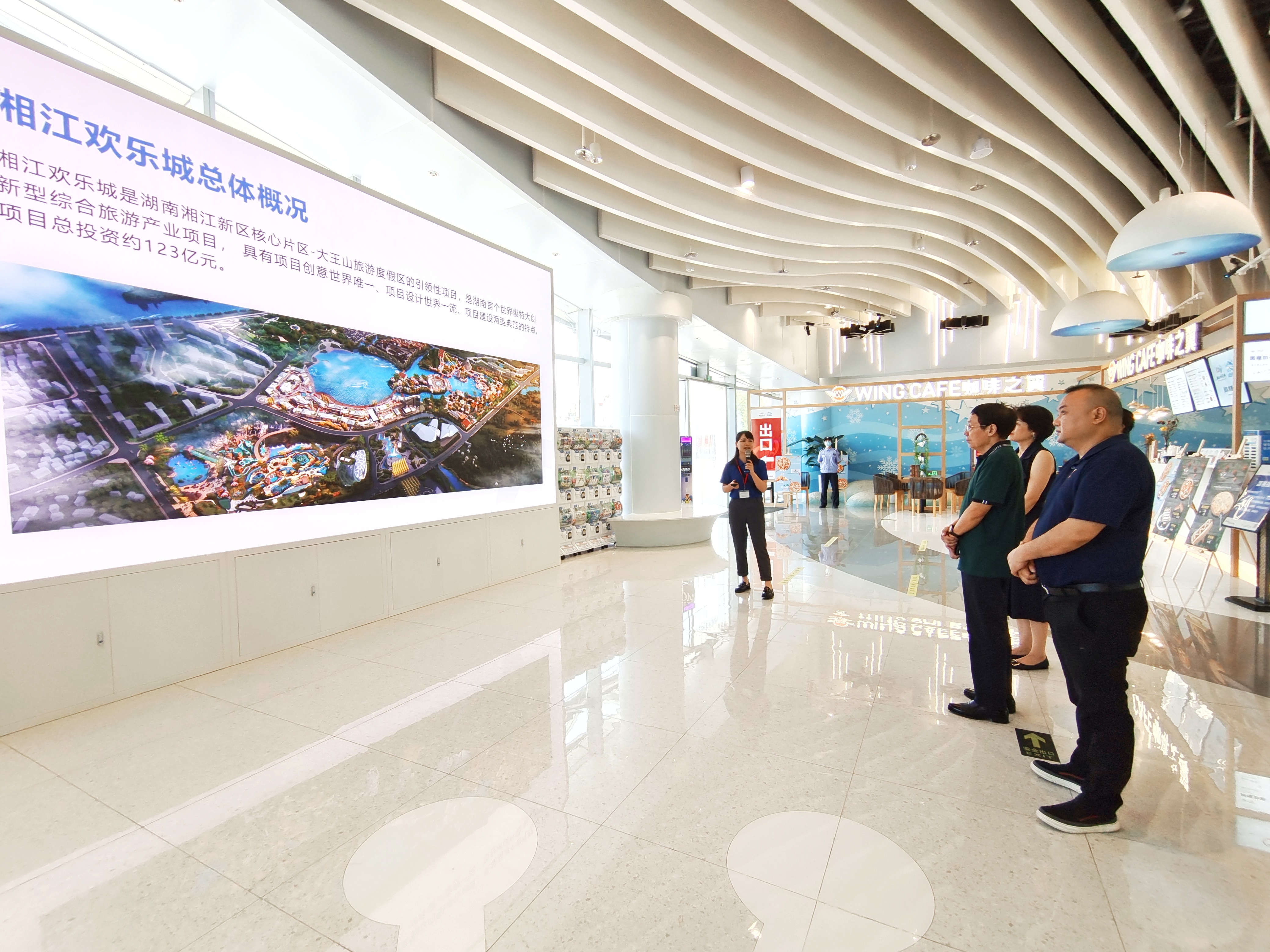 接着,调研组一行来到了由湘江集团投资建设运营的湘江欢乐城。园区工作人员介绍了大王山旅游度假区整体概况、湘江欢乐城建设运营等情况。据介绍,湘江欢乐城是湖南湘江新区核心片区大王山旅游度假区的引领性项目、湖南首个世界级特大创新型综合旅游产业项目,其中欢乐雪域是全球唯一悬浮于百米深坑上的冰雪乐园。一期核心乐园项目欢乐水寨、欢乐雪域,于2020年7月盛大开园,成为了中国中部网红玩乐新地标。
