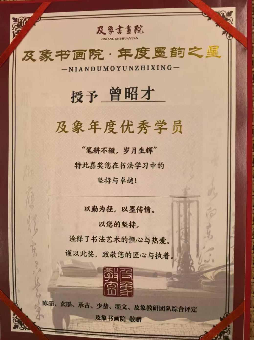 11、2026年1月,曾昭才老师为全国爱心大使、“中华之魂”十大功勋人物、新中国成立六十周年感动中国60人、全国劳动英雄模范,华夏新供给经济学研究院监事长、湖南省“魅力湘女”汤林放题写“榜样”。